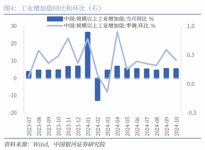 2024年前三季度,工业生产成为经济增长的压舱石,2024年1-10月工业增加值累计增长5.8%。一是一系列政策支持工业经济稳定增长,二是新质生产力相关产值快速攀升,三是在9月政策转向以来需求逐渐驱动工业生产。展望2025年,工业在基本盘持续稳定增长的情况下,有效需求的持续恢复、新质生产力的进一步推进以及绿色工业的转型将继续推动工业增加值保持较高增速,预计2025全年增速5.3%。结构方面,我们认为主要有以下要点: