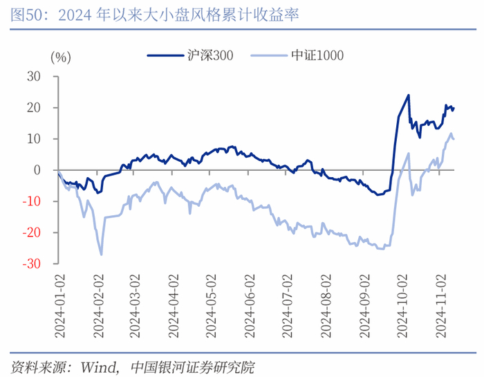 2024年以来,截至11月13日,以沪深300为代表的大盘风格累计上涨19.81%,以中证1000为代表的小盘风格累计上涨9.97%,大盘风格整体占优。具体来看,年初至2月初,在美联储降息时点推迟、国内经济修复斜率偏缓的影响下,叠加微盘股流动性紧缩,市场呈现回调态势,大盘风格防御属性凸显,市场表现明显占优。随着稳增长政策持续加码,监管层出台一系列旨在稳定市场的举措,A股市场开启反弹行情,小盘股收复部分失地。3月下旬以来至8月底,大盘风格再度占优。而随着9月24日以来A股市场开启向上行情,个人投资者加速入市,市场成交额处于高位水平,对小盘风格形成显著支撑。