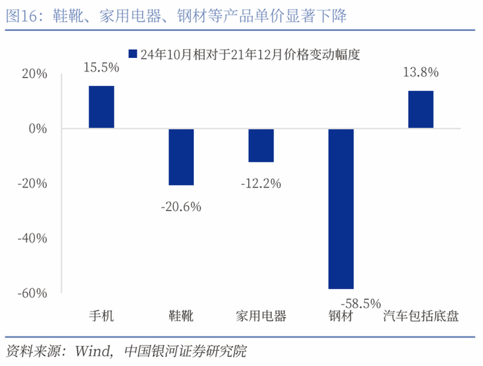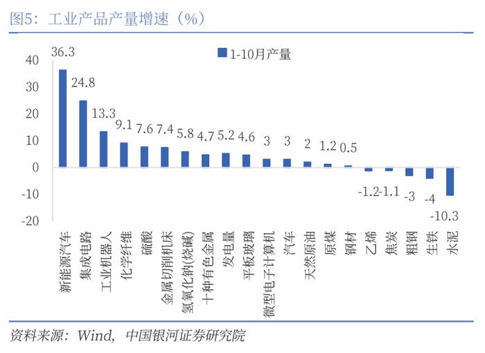 一是2025年有效需求持续恢复,有望带动耐用消费品增长。有效需求不足在2023年以来持续制约工业经济的健康发展, PPI的持续下行不断侵蚀着企业利润。2024年3月国务院发布《推动大规模设备更新和消费品以旧换新行动方案》;7月,国家发展改革委、财政部联合印发《关于加力支持大规模设备更新和消费品以旧换新的若干措施》。9月政治局会议直击经济发展的痛点,在房地产市场、微观主体参与新经济以及政策导向从供给转向需求均有重视。9月下旬,一揽子政策彻底激发了市场信心以及消费活力,从数据上也可以看出10月汽车工业增加值上行1.6pct至6.2%,电气机械增加值从8月的2.6%大幅上涨至5.1%;产量上新能源汽车1-10月累计同比36.3%,表明汽车和家电以旧换新政策的拉动效果明显。工信部在2024年10月23日召开发布会表示,要继续深入推进十大重点行业稳增长工作方案实施,同时在扩需求、增动能、优环境方面下更大功夫。因此受内需回升带动的耐用消费品制造业如计算机电子、电子信息和汽车制造等行业增加值会得到有效增长。