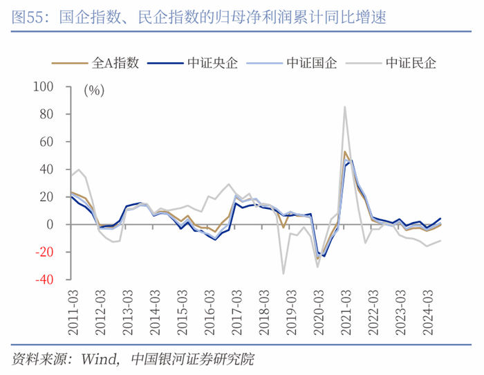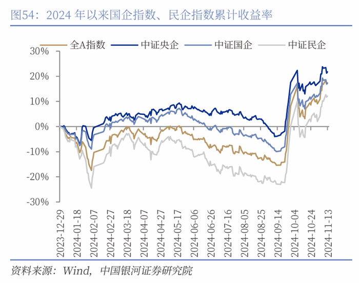 央国企盈利较为稳定,业绩波动相对低于民企。2024年三季报,中证央企归母净利润累计同比增长4.29%,中证国企的增速为1.13%,均高于全A指数的增速,而中证民企的增速为-11.88%,远低于中证央企、中证国企的增速。