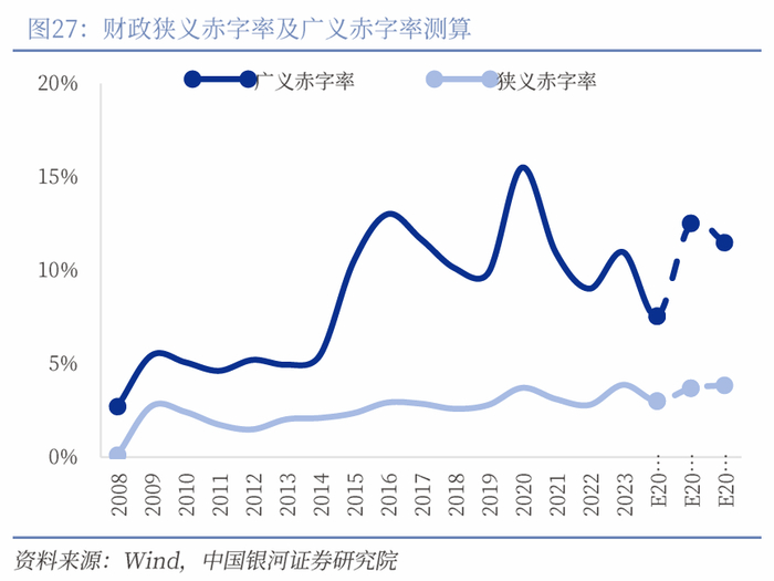 一是狭义和广义赤字率均有望大幅提升。广义赤字率既决定内需水平,亦受外需压力影响,历史数据显示外需走弱时往往是广义赤字率加码时期,且由于广义赤字率提升将逐步推动PPI温和回升。基于明年可能面临的外需压力和国内经济稳定转型诉求,我们认为明年一般公共预算支出有必要保障5%以上的支出增速,按照目前税收和非税收入水平测算,对应狭义赤字率或在3.5%左右(一般债+普通国债合计5万亿元左右);专项债扩容、扩围基础上,明年专项债额度有望提升至4.5万亿元左右;超长期特别国债明年发行规模或在2万亿元左右,在今年两重两新基础上有望进一步向消费和社会保障领域倾斜;特别国债补充商业银行一级资本总规模或在1万亿元左右,2024年底或2025年年初有望落地;考虑到新增100万套城中村改造和新型城镇化建设明年例如PSL等准财政政策工具也有加码空间,规模或在8000亿元左右。合计以上政策工具,2025年广义赤字率水平应在12%左右,大幅高于2024年赤字率水平。