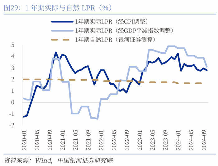相机抉择实施降息,全年政策利率的累计降幅可能在20BP,引导5年期LPR下调40-60BP。支持性的货币政策需要实际利率小于自然利率,才能到达实质性宽松。基准情形预估2025年CPI=1.0%,GDP平减指数=0.14%。1年期LPR如果下降20BP至2.9%,1年期LPR的实际利率(经CPI调整)为1.9%,实际利率(经GDP平减指数调整)为2.76%,仍高于我们测算的1年期自然LPR(1.59%)。因此目前政策利率仍有调降的必要,但依然是稳健的步伐。2025年如果汇率再次面临压力,央行可能保持政策利率不变,引导5年期LPR下降,带动融资成本下行,实现信用宽松。在汇率压力阶段性缓和时期相机抉择调降政策利率。