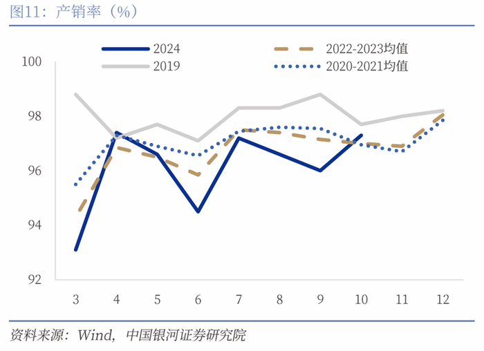 三是内生动能持续复苏,提振制造业投资预期。2024年,年中大规模设备更新和消费品以旧换新政策的出台和持续加力弥补了制造业领域日益严峻的供需错配问题,9月的政策拐点更是扭转了市场信心,对需求侧注入强力动能,制造业产销率在10月录得97.3%,上行1.3pct且高于过去两年,反转了本年度以来产销持续低迷的情况。在内需不足的问题得到政策的全面重视后,预计2025内生动能也会反过来带动制造业投资的上行,让制造业领域完成从政策驱动到需求驱动的转变。