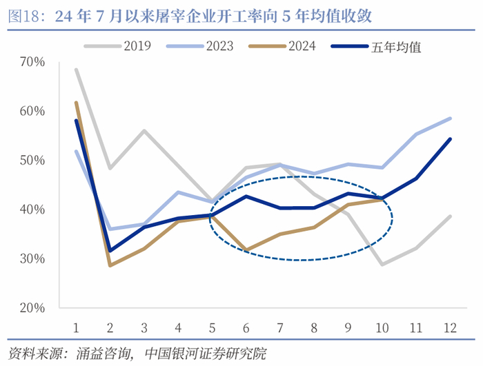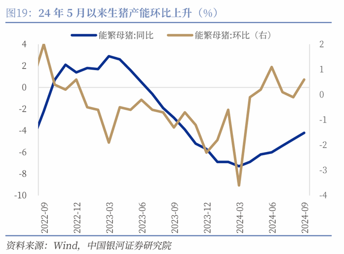 第一,猪价平稳回落,但下行斜率或较为温和。需求端来看,屠宰企业开工率向五年均值收敛,2024年猪肉需求正在回暖。涌益屠宰企业全国平均开工率自2024年6月的31.7%上升至10月的42%,与五年均值差由-11%上升至-0.3%,或表明2024年猪肉需求正逐渐回暖。供给方面来看,2024年5月能繁母猪存栏量开始环比上升,按照10个月左右的时间推算,即对应2025年3月生猪价格将步入下行通道,考虑到季节性因素影响,春节后是猪肉传统消费淡季,猪价或提前至2025年2月步入下行周期。此外,由于本轮周期补栏速度明显弱于往年,甚至在2024年8月猪价年内高点的情况下能繁母猪存栏量出现环比下降,我们预判后期补栏会持续疲弱,2025年猪价回落速度或偏慢,猪价跌幅或有限。