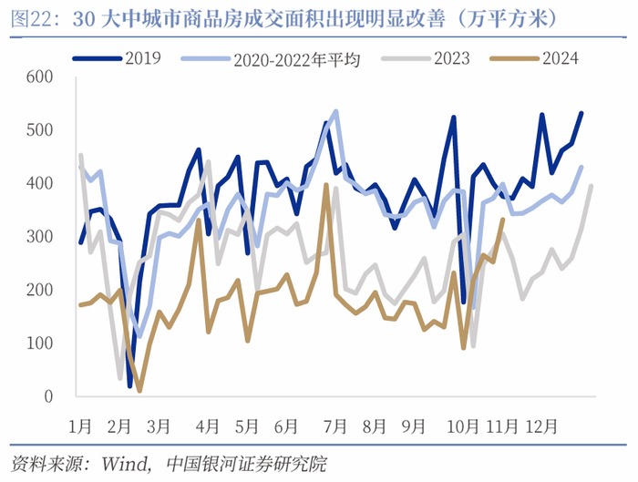 当前房地产政策的主要目标是促进房地产市场止跌回稳,目前来看前期系列政策效果已经有所显现,核心城市商品房价格已有企稳迹象。展望2025年房地产市场,我们认为基本政策框架已经较为清晰,重要的是政策落地执行效果,主要关注2025年新增100万套城中村和危旧房改造的进展以及专项债用于闲置土地和存量商品房收购的具体规模。其中,新增100万套危房改造项目主要影响房地产开发投资增速,专项债用于闲置土地和存量商品房收购主要影响房地产企业现金流和住宅价格。