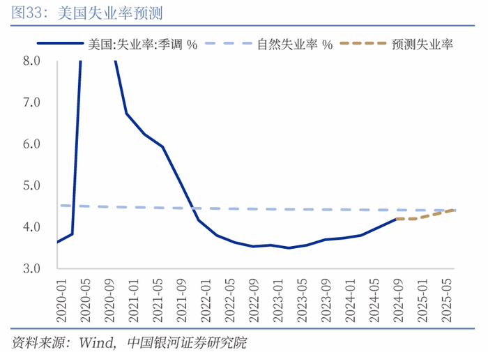 预计2025年城镇调查失业率保持稳定,全年均值5.1%左右。主要原因有三:一是财政政策的发力以及化债政策会大幅改善市场流动性和地方投资支出,带动实物工作量和用工需求的上升;二是内需的修复和企业预期的提升有望促进作为就业大户的中小企业提升招聘力度;三是新质生产力的培育和制造业高质量发展将创造新的岗位需求。