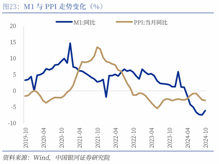 第二,M1增速止跌上行,对PPI修复带来支撑。2024年10月M1同比增速-6.1%,2024年内首次出现上行,驱动M1增速回暖的原因包括地产销售数据明显好转以及企业预期改善带来资金活化程度提升。2024年11月份以来,多地持续加力,优化房地产领域政策措施,包括加大购房补贴力度、提高住房公积金最高贷款额度等,助推房地产市场继续保持止跌回稳的积极势头。另一方面,企业预期也有望逐步回暖,10月制造业PMI重回扩张区间,BCI企业销售、利润、招工前瞻指数明显改善。