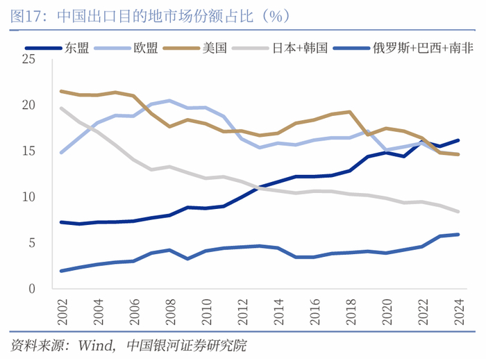 三是持续开拓新贸易伙伴,新兴国家市场进一步扩大。从出口国别结构来看,2024年中国对传统欧盟、美国、日韩等市场出口金额占比我国比重分别为14.6%、14.6%和8.4%,分别较2023年回落0.2%、0.2%和0.7%。对东盟出口金额占我国总出口比重为16.15%,较2023年上升了0.65个百分点,对俄罗斯、巴西和南非出口占比共为5.9%,小幅上升0.2%。随着诸如上述新兴国家等新贸易伙伴的开拓,有助于拓展中国出口商品的市场空间,并缓解传统欧美贸易伙伴的需求周期。