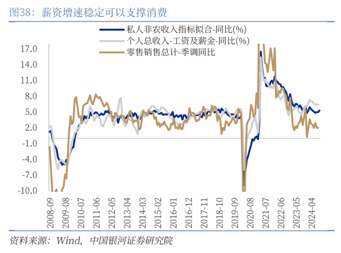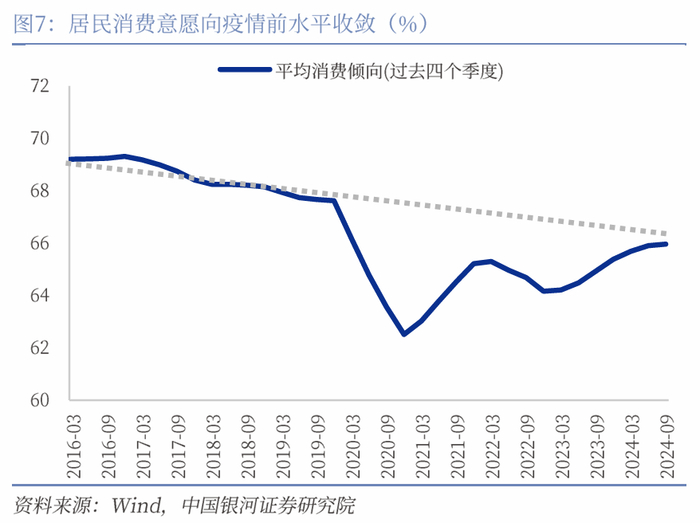 第一,在楼市和股市逐步企稳修复后,居民财富效应的释放将促进消费复苏。自926政治局会议后,提振资本市场、促进房地产市场止跌回稳措施相继出台,截止11月15日,申万房地产行业指数上涨17%,沪深300指数上涨12%,2025年资本市场和房地产市场有望延续回暖。我们利用中国家庭追踪调查的数据研究发现,与工资性收入、经营性收入、转移性收入相比,居民的财产性收入带来的边际消费倾向最高,资本市场和房地产市场的回暖将直接提高居民财产性收入,从而有效提振居民消费。此外,随着经济逐步走出疫情影响,预计2025年居民可支配收入将保持平稳增长,增速与实际经济增速基本持平,居民消费意愿逐渐向疫情前水平收敛,居民收入和消费意愿的平稳复苏有望支撑消费持续改善。2024年11月12日国务院发布了对《全国年节及纪念日放假办法》的修改决定,将全体公民放假的节假日数量从原先的11天增加至13天,有利于消费潜力的释放。