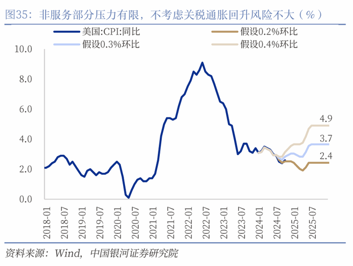 第四,外部影响可能是2025年需要额外关注的重点。特朗普政府主张的保护主义政策可能将在明年施加高关税,或对我国出口产生一定冲击。但参考特朗普1.0 阶段,特朗普或优先推对内减税,对非美国家加关税可能在四季度前后,对2025年国内的进出口拖累相对可控。结合WTO对于2025年全球货物贸易增速的预测为3%,进出口有望实现小个位数同比增长。同时,外围压力之下关注我国可能采取的更大力度的对冲政策,明年扩大财政赤字、保持降息降准节奏的货币宽松窗口大概率都将能有所观察。外部不确定性提升下,国内政策相机抉择的特征将更为明显。