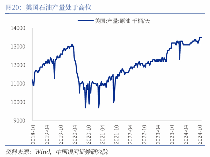 第二,供应过剩风险与需求增长乏力构成主要挑战,油价或承压。供给端来看,OPEC成员国宣布维持自愿减产计划至2024年12月末,,且有进一步推迟的可能性,非OPEC+尤其是美国页岩油产量的持续增长将导致2025年产量增速较2024年有所回升,这意味着未来全球原油供给可能保持宽松。需求端来看,根据2024年11月EIA能源展望报告,2024年美国的原油需求预计与2023年持平,美国库存水平自9月下旬以来持续小幅上行,这反映出美国市场对原油的消费需求趋于饱和平稳。此外,中国刺激性政策加码出台,或带动我国原油需求小幅回升,但中国向新能源转型等因素或将制约整体需求复苏斜率。