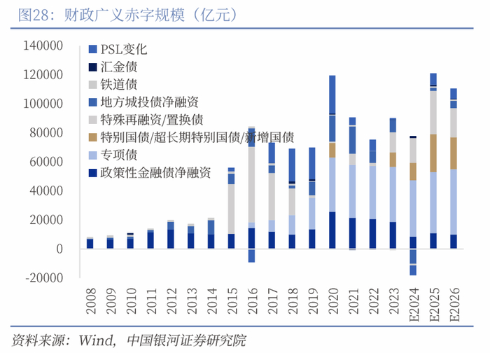 结合会议表态,2025年财政政策展望:首先,预计明年将提升中央赤字空间,赤字率有望提升至3.5%;其次,考虑到对“两重两新”项目的支持、国有银行资本金补足及地产的收储需求,超长期特别国债发行规模或在2万亿,专项债额度有望提升至4万亿以上。其他政策工具除了进一步加码的中央赤字(超长期特别国债)外,或许还有广义财政工具,例如PSL等政策工具的加码;第三,财政在化解债务、支持国有行补充资本、扩大内需三个层面发力,综合估算财政扩张规模合计或达12万亿,较今年明显扩张。