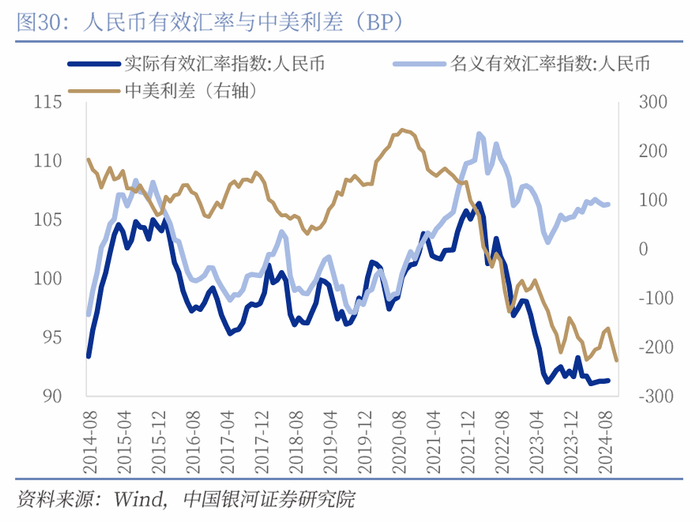 货币政策宽松的传导路径包括降低融资成本,推动股市稳步上行、保持有弹性的汇率,然后作用于实体经济。截至2024年3季度,金融机构企业贷款加权平均利率为3.51%,比2023年末下降24BP,金融机构个人住房贷款加权平均利率为3.31%,比2023年末下降66BP。资本市场已成为货币政策的重点考量,央行已创设两项稳定资本市场的工具,平准基金也在研究中。具备弹性的汇率将有助于促进经济增长。如果美国对中国再次加征关税,从贸易条件来看,弹性的汇率需要适当小幅贬值以对冲出口产品价格的上升,寻找新的合理位置保持双向波动,以实现新的贸易均衡以及国际收支平衡,这对中国经济将是积极影响。