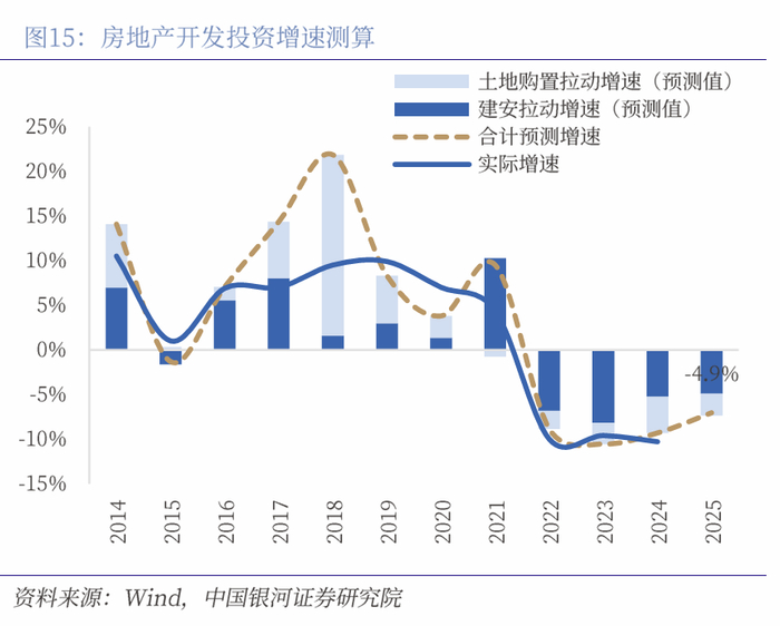 2025年房地产开发投资增速预计在-7.1%。对于房地产开发投资完成额的测算可以分为建筑安装和土地购置两部分,其中建筑安装占开发投资比例或在60%,土地购置占比在40%。我们测算2025年建筑安装部分的施工面积增速降幅或有所缩窄,主要是考虑到2025年新增100万套城中村危房改造对新增施工面积或有显著改善,整体投资完成额增速或在-8.2%,对房地产开发投资增速的影响为4.6%。此外,土地购置部分我们认为基于明年专项债新增用于闲置土地收购,土地收入降幅有望收窄,整体增速大致为-6.1%,对房地产开发投资增速影响为-2.5%。以上二者合计测算下房地产开发投资增速在-7.1%左右。