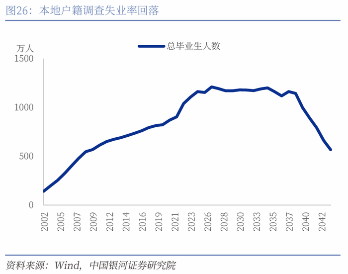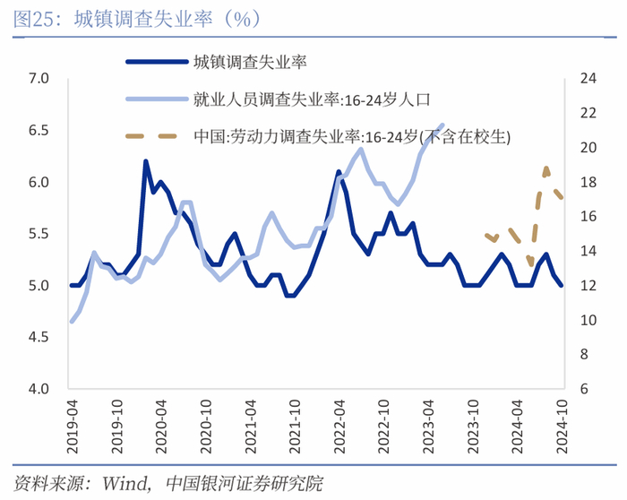 但高校毕业生就业有一定压力。10月16-24岁(不含在校生)失业率17.1%。根据教育部、人力资源社会保障部召开2025届全国普通高校毕业生就业创业工作会议,2025年高校毕业生预计1222万人,比上年增加43万人,不断升高的毕业生数量考验着经济创造就业的能力。同时按照近年来统计的全国人口出生情况,2016年新生儿达到峰值,为1786万人,对应高考时间为2034年,本科毕业时间为2038年,也就是说我国还会有15年左右的毕业生高峰。高校毕业生的持续提升一方面代表了我国高等教育事业的显著成就,为社会输入了大量高质量人才。另一方面也带来了毕业生无法从事匹配自身职业追求的工作的情况。叠加2025年外部的不确定性,更加考验我国产业升级、加大内循环以及发展服务业新模式新业态的能力。