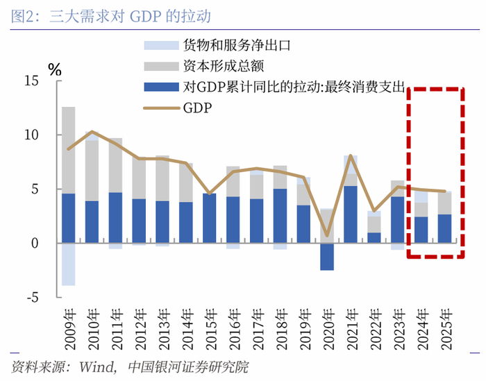 在高质量发展和稳增长的政策主线支持下,我国经济基本面在2025年将继续改善向好,内需将持续回升,但同时也要注意到,中美博弈的压力以及经济结构转型中经济增长也存在一定挑战,明年经济或将波浪式发展。整体来看: