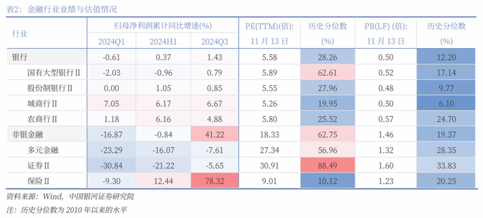 2024年前三季度,银行业的归母净利润累计同比增长1.43%,增速较中报扩大1.06个百分点,主要因投资收益快速增长。10月12日,财政部提到,将发行特别国债支持国有大型商业银行补充核心一级资本,提升这些银行抵御风险和信贷投放能力,更好地服务实体经济发展。该项增量政策举措对国有大型商业银行直接利好,有助于带动银行股估值提升,催生银行股上涨行情。此外,银行股股息率处于全行业较高水平,中长期投资价值较高。
