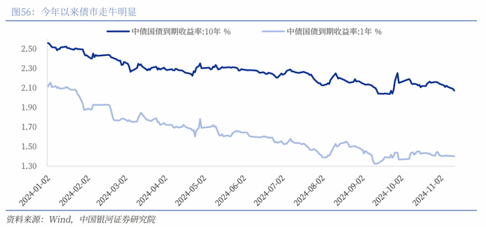 2024/10至今,市场主要受到增量财政政策的预期及落地影响,利率震荡回落。10月主要是财政部发布会官宣年内将有增量财政落地,市场博弈政策预期带来债市小幅波动;11月人大常委会后增量财政落地,年内2万亿地方债限额增量基本未超市场预期,债市演绎利空出尽行情。截至11/12,10Y、1Y国债收益率波动下行,分别较Q3变动-8BP、3BP至2.07%、1.4%。