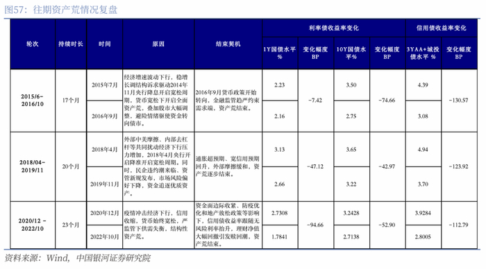 另外,在政策出台和供给增加的基础上资产荒逻辑边际削减,2025年资产荒对债市影响将有所收敛。在今年924一揽子政策超预期落地后,市场风险偏好有明显提振,股债跷跷板演绎明显,资金边际流出债市、流入股市,叠加保险等债市主要配置力量也面临普遍的非银成本倒挂问题,需求端在2025年可能会有边际回落;而明年宽财政之下政府债供给将有较大规模扩张,供给端增量相对可观,二者相结合明年债市供需矛盾可能会有所缓解,资产荒程度或会收敛。此外,从对过往几轮资产荒的梳理来看,过往资产荒退出契机基本为需求端大幅受约束或基本面及预期发生根本转变,目前来看短期政策效果仍是待观察阶段暂时难有明确的退出要素触达,但主要关注年底12月中央经济工作会议对明年的政策定调以及3月两会对于经济的目标预期,不排除超预期提振的可能。因此,预计短期资产荒逻辑还在,但是对债市的支撑作用或边际削减,政策影响下机构博弈情绪或仍将加剧债市震荡,而重大会议后宽信用预期扭转资产荒亦有结束可能。