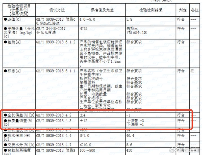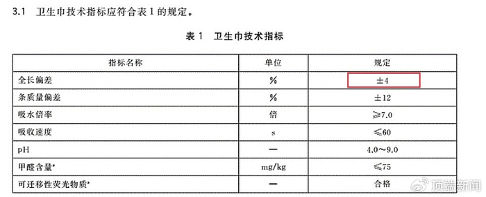 顶端新闻记者从公开资料发现,由国家市场监督管理总局、中国国家标准化管理委员会发布的现行国家标准《卫生巾(护垫)(GB/T 8939-2018)》规定:卫生巾的全长偏差在±4%,全长偏差=(平均值-标称值)/标称值×100%。试验方法为,用直尺测量试样的全长(从试样最长处量取),准确至1mm。