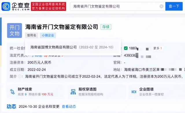 10月30日,海南省国博文物商店有限公司的企业名称变更为“海南省开门文物鉴定有限公司”。该公司成立于2022年2月,法定代表人为丁祥,并由其全资持股。丁祥的抖音社交账号“听泉赏宝”和“博文加点油”的粉丝数量分别为3063.8万和558.4万。