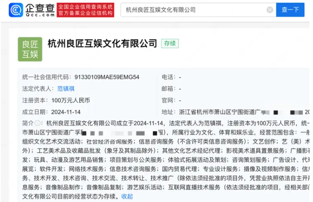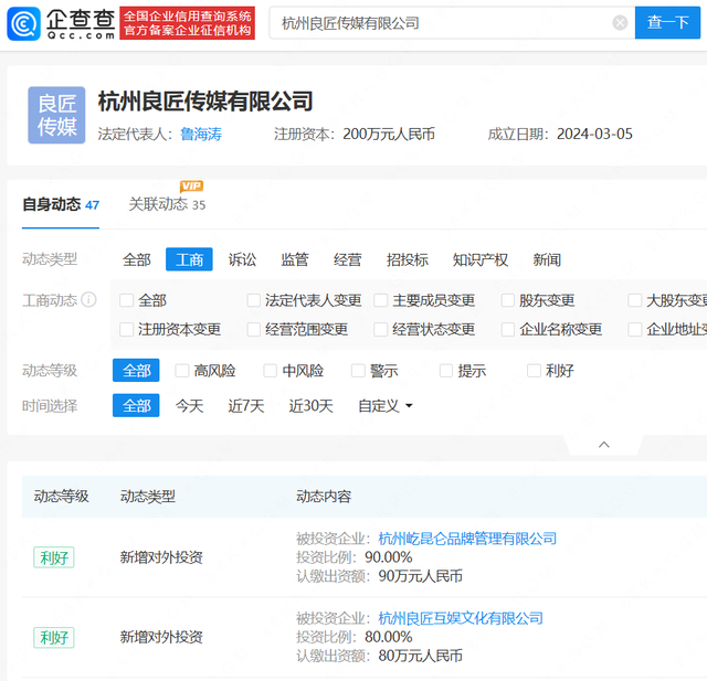 此前不久,杭州良匠传媒有限公司投资成立了杭州良匠互娱文化有限公司。法定代表人为范镇祺,注册资本100万人民币,经营范围含文化娱乐经纪人服务、文艺创作、网络文化经营、营业性演出、演出经纪、互联网信息服务、游艺娱乐活动、互联网直播技术服务等。股东信息显示,该公司由听泉赏宝关联公司杭州良匠传媒有限公司、黄杨奇分别持股80%、20%,“听泉赏宝”(丁祥栩)持有前者49%股份。