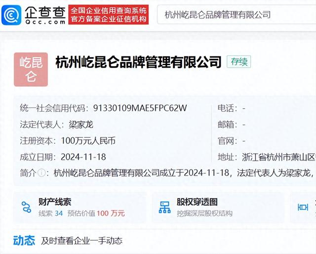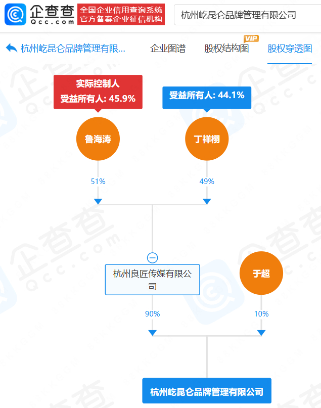 据企查查APP显示,近日,浙江杭州屹昆仑品牌管理有限公司成立,法定代表人梁家龙,注册资本100万元,由杭州良匠传媒有限公司、于超分别持股90%、10%,听泉赏宝主播(丁祥栩)持有前者49%股份。
