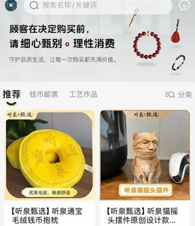 有网友发现“听泉鉴宝”APP已上线一段时间,主打鉴别、回收、交易,并开设了商城板块,售卖商品包括项链、手串等。10月29日,再次查看该APP商城页面发现,此前售卖的商品多已下架,仅存在毛绒钱币抱枕及听泉猫摇头摆件。