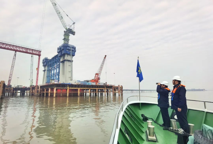 “大桥主塔采用钢箱-钢管混凝土约束组合体系,为世界首创。主塔由30个节段组成,每一节均需要通过船运进江,并在江中吊装,对稳性的要求特别高。”张靖皋长江大桥建设项目部相关负责人告诉记者,张家港海事部门专题编制了钢护筒沉放施工交通组织方案,依托全要素水上“大交管”高效协同优势,确保所有航经作业水域船舶减速缓行避免掀浪,为工程建设辟出了海事服务的“绿色通道”。