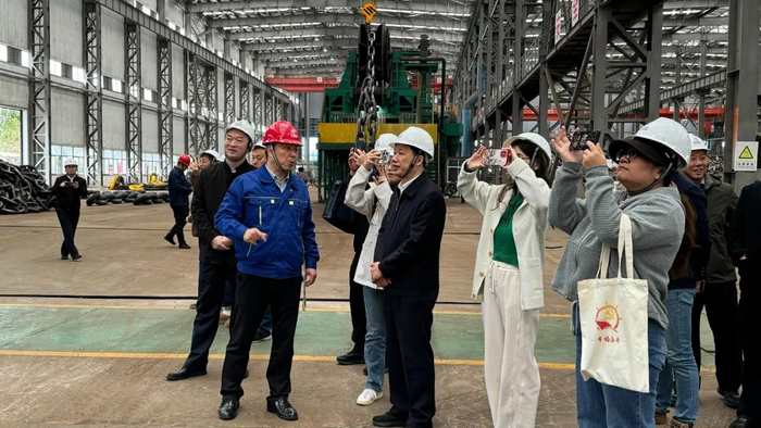 媒体行当日,记者们来到江苏亚星锚链股份有限公司(以下简称“亚星锚链”),它是我国大型船用锚链和海洋系泊链及附件、矿用链生产和出口基地。在该公司海洋工业园生产车间,直径220毫米的链条正在生产中。“这是目前全球最大规格的链条,单个环的重量就达到1.5吨。而我们现在所处车间的这条生产线,也是全球最大的锚链制造生产线。”江苏亚星锚链股份有限公司副总经理张卫新介绍。