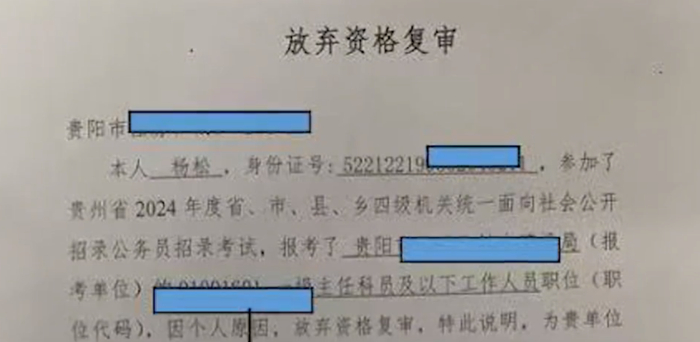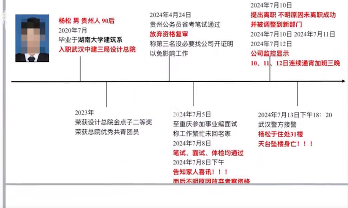 杨泳表示,他4月份曾因工作原因放弃贵州公务编,之后考重庆事业编进入体检环节。7月9日,他却放弃后续考察资格“他7月8日说回中建三局那里辞职,辞职好之后到重庆上班”。中建三局设计总院事发至今态度冷漠,家属认为杨松提出辞职后被公司压榨胁迫。家属说到:“我们要真相,这事和公司脱不了干系 公司在推卸责任”。