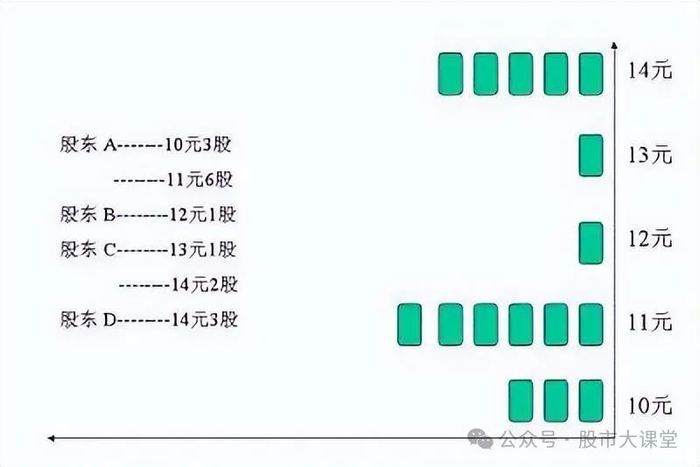 随着交易的继续,筹码会在投资者之间进行流动,因而筹码分布也不是一成不变的。假定随后发生了一个交易:B把他的12元价位建仓的4股股票卖掉了3股,成交价是14元,由D承接,于是筹码分布就成为下图样子: