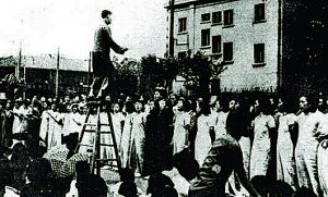 1936年6月7日,民众歌咏会在上海公共体育场高唱《义勇军进行曲》,站在高凳上指挥者为刘良模。