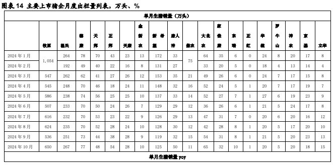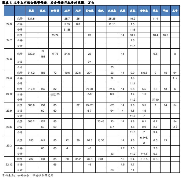 2024 年 6 月末,牧原、温氏的能繁母猪存栏量分别为 330.9 万头、165 万头,较 3 月末分别增加 16.7 万头、10 万头,两家公司合计增加约 26.7 万头,占 Q2 全国新增能繁母猪存栏量 46 万头的 58%。2024 年 9 月末,正邦、神农的能繁母猪存栏量分别为 25.7 万头、11.4万头,较 6 月末分别增加 4.1 万头、1.6 万头,两家公司合计增加约5.7 万头,占 Q3 全国新增能繁母猪存栏量 24 万头的 23.8%。