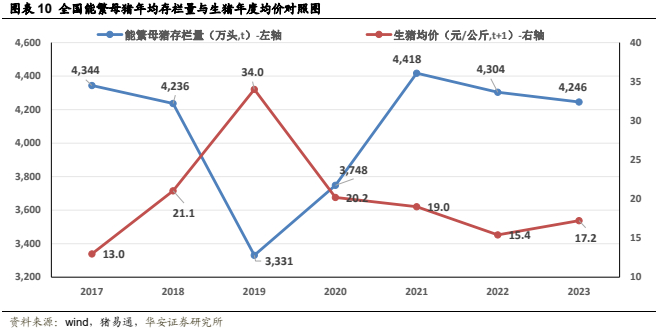 如图 10 所示,2017-2023 年,全国能繁母猪年均存栏量与 1 年后全国生猪年度均价呈现出高度负相关性,除 2022 年例外,我们认为是 2021 年低效母猪占比过高,导致 2022 年养殖生产效率大幅提升带来的数据失真。