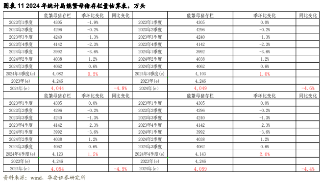 根据统计局数据,我们假设 2024Q4 能繁母猪存栏量环比上升 0.5%-2%,对应2024 年能繁母猪存栏均值较 2023 年下降 4.4%-4.8%。根据涌益咨询、上海钢联数据,我们假设 2024 年 11-12 月能繁母猪存栏量月环比上升 1%,对应 2024 年能繁母猪存栏均值较 2023 年分别下降 0.56%、2.36%。从年度能繁母猪存栏推断,2025年生猪价格将获得有力支撑。