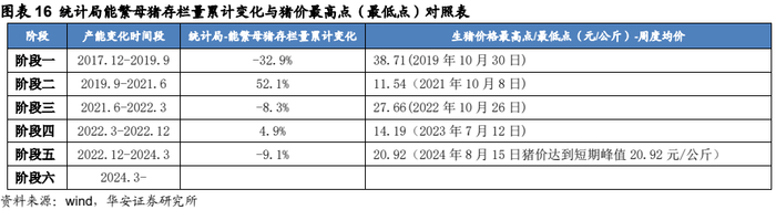 回顾 2021 年 6 月-2022 年 3 月,统计局公布的能繁母猪存栏量累计下降 8.3%,受产能去化、延迟配种、二育等多重因素影响,猪价于 2022 年 10 月 26 日达到峰值 27.66 元/公斤。本轮周期 2022 年 12 月-2024 年 3 月累计去化 9.1%,2024 年 4月农业部能繁母猪存栏量环比再降 0.1%,整体去化已超过 2021-2022 年,较 2021年 6 月能繁母猪存栏量更是下降了 12.5%,2024 年猪价处于上行周期。