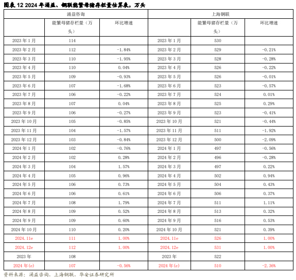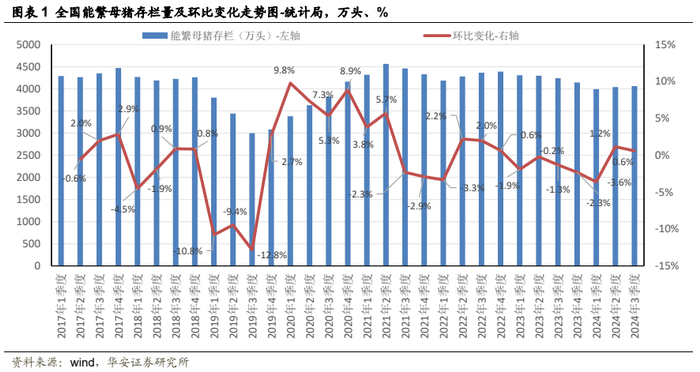 从官方数据看,2024 年 2 季末、3 季末,能繁母猪存栏量分别为 4038 万头、4062 万头,环比分别小幅提升 1.2%、0.6%,Q3 生猪均价虽达到 19.39 元/公斤,补栏积极性仍然偏弱。