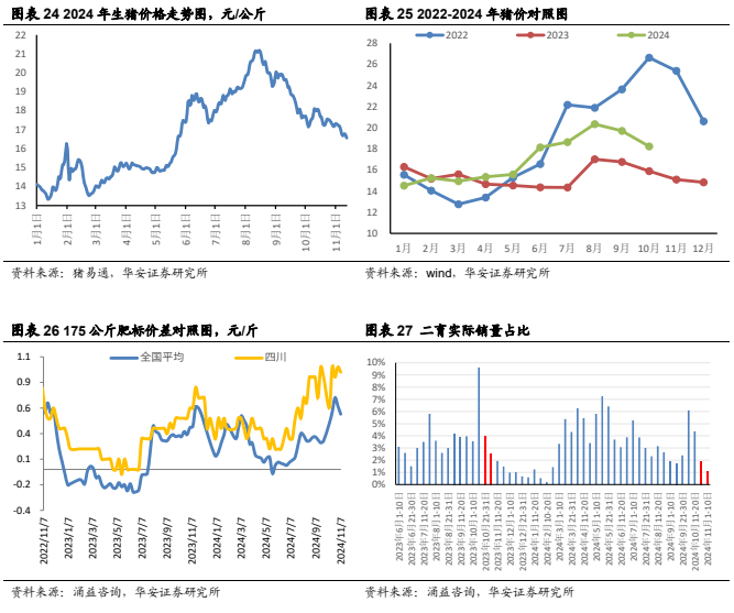 本轮周期 2022 年 12 月-2024 年 3 月累计去化 9.1%,2024 年 4 月农业部能繁母猪存栏量环比再降 0.1%,整体去化已超过 2021-2022 年,较 2021 年 6 月能繁母猪存栏量更是下降了 12.5%,2024 年猪价处于上行周期。8 月 11 日全国生猪价格达到今年以来的峰值后,猪价呈现震荡下行态势。我们认为,猪价大幅回调是受大体重猪持续出栏、短期二育不振等因素影响。2024 年 9 月下旬以来,肉猪价比值稳定在1.6 以上,与 2023 年同期基本持平;11 月 7 日毛白价差 5.03 元/公斤,高于去年同期的 4.12 元/公斤,猪肉消费并未持续走弱;2024 年11 月 10 日,育肥栏舍利用率同比下降 12%-43%,周环比下降 5%-23%,标肥价差维持高位,随着消费旺季的到来,猪价有望企稳回升。