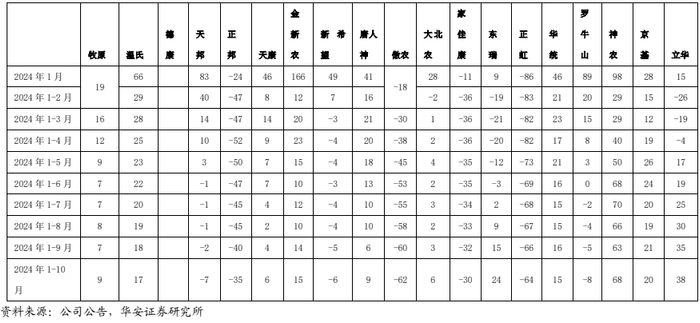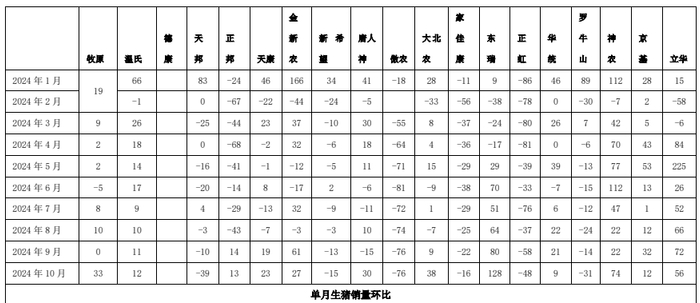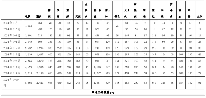 2024 年 1-10 月,上市猪企出栏量 1.27 亿头,同比上升 2.8%,上市猪企出栏量(万头)从高到低依次为,牧原股份 5664、温氏股份 2423、新希望 1367、德康牧业 693、天邦食品 499、大北农 493、唐人神 329、正邦 302、中粮家佳康 280、天康 243、华统股份 215、傲农 188、神农集团 187、京基智农 182、金新农 98、立华股份 94、东瑞股份 68、罗牛山 58、正虹科技 6.9;出栏量同比增速从高到低依次为,神农集团 68%、立华股份 38%、京基智农 20%、温氏股份 17%、东瑞股份24%、金新农 15%、华统股份 15%、牧原股份 9%、唐人神 9%、天康 6%、大北农6%、新希望-6%、天邦食品-7%、罗牛山-8%、中粮家佳康-30%、正邦-35%、傲农-62%、正虹科技-64%。