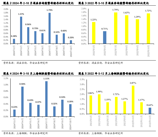 从行业数据看,2024 年2-10 月,涌益咨询能繁母猪存栏量环比分别上升 0.28%、1.57%、0.96%、0.73%、0.61%、1.79%、0.52%、0.6%、0.2%;2024 年 3-10 月,上海钢联能繁母猪存栏量环比分别上升 0.22%、0.94%、0.43%、0.37%、1.11%、0.32%、0.53%、0.39%。对照 2022 年产能恢复期,5-10 月涌益咨询能繁母猪存栏量环比分别上升 1.23%、0.71%、1.79%、1.63%、1.39%、1.73%;5-12 月,上海钢联能繁母猪存栏量环比分别上升 1.86%、1.99%、1.19%、1.73%、1.27%、2.87%、1.17%、0.64%。2024 年以来,生猪产能恢复明显弱于 2022 年。