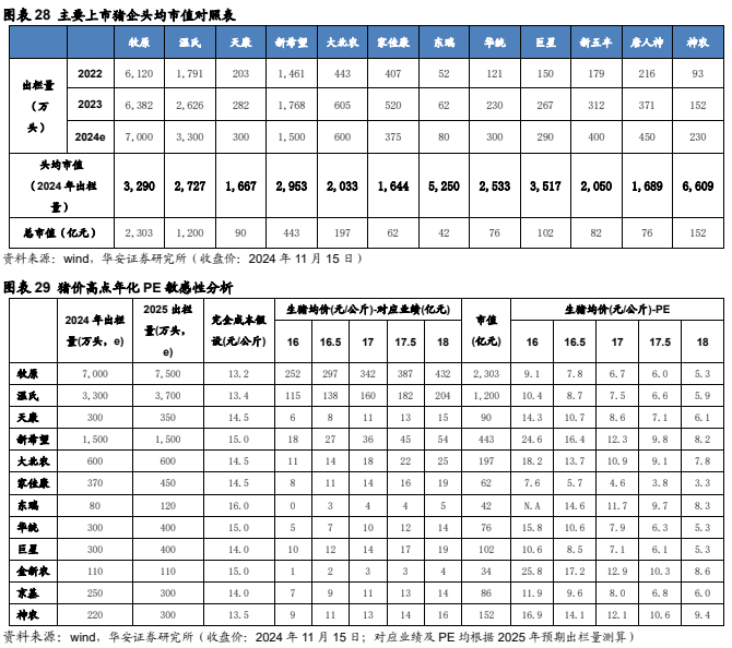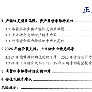 本报告摘自华安证券2024年11月19日已发布的《【华安证券·农林牧渔】行业专题:生猪养殖行业系列报告十一:产能恢复持续偏弱,2025年猪价获有力支撑》,具体分析内容请详见报告。若因对报告的摘编等产生歧义,应以报告发布当日的完整内容为准。