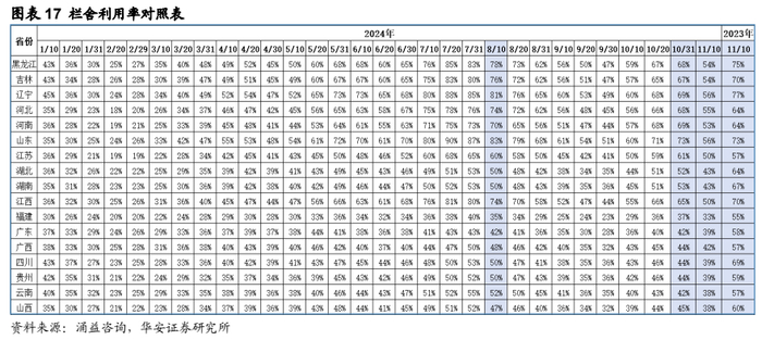 2024 年 9 月下旬以来,肉猪价比值稳定在 1.6 以上,与 2023 年同期基本持平;2024 年 11 月 7 日毛白价差 5.03 元/公斤,高于去年同期的 4.12 元/公斤,猪肉消费并未持续走弱。2024 年 11 月 10 日,育肥栏舍利用率同比下降 12%-43%,周环比下降 5%-23%,标肥价差维持高位,随着消费旺季的到来,猪价有望企稳回升。