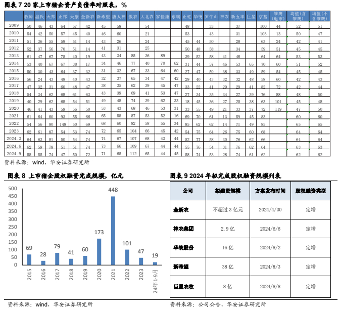 从官方数据看,2024 年 2 季末、3 季末,能繁母猪存栏量分别为 4038万头、4062 万头,环比分别小幅提升 1.2%、0.6%,Q3 生猪均价虽达到 19.39 元/公斤,补栏积极性仍然偏弱;从行业数据看,2024 年以来生猪产能恢复也明显弱于 2022 年。截至 2024 年 9 月末,20 家上市猪企平均资产负债率仍维持在 62%的高位,且上市猪企股权融资完成规模有限,行业资金压力持续处于历史高位。