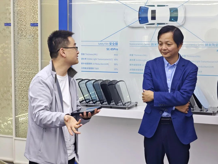 总裁助理夏学武首先带领在场领导参观纳尔股份的全新展厅,详细介绍了公司的发展历程和现状。姜学松常务副院长作为高分子材料领域专家,对数码喷印材料、漆面保护膜等纳尔股份主营产品所展现出来的先进科研水平和高新技术产业化应用表示认可与肯定。