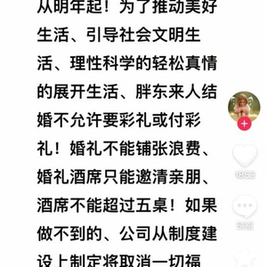 从明年起,为了推动美好生活、引导社会文明生活……胖东来人结婚不允许要彩礼或付彩礼!婚礼不能铺张浪费,婚礼酒席只能邀请亲朋,酒席不能超过五桌!如果做不到的,公司将从制度建设上取消一切福利!未来的胖东来人是不允许靠父母买房买车!完全有能力靠自己主宰创造和享受美好人生。