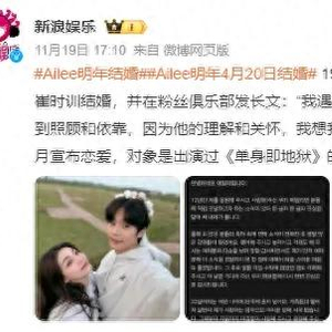 11月19日,韩国“铁肺歌后”Ailee(李艺真)宣布将于明年4月20日与未婚夫崔时训结婚,并在粉丝俱乐部发长文:“我遇到了一个可靠的人,他给了我肩膀,让我得到照顾和依靠。因为他的理解和关怀,我想我们会一辈子在一起。”
