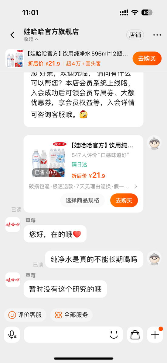 而对于“不能长期喝纯净水”的问题,娃哈哈旗舰店客服则表示:“暂时没有这个研究。”