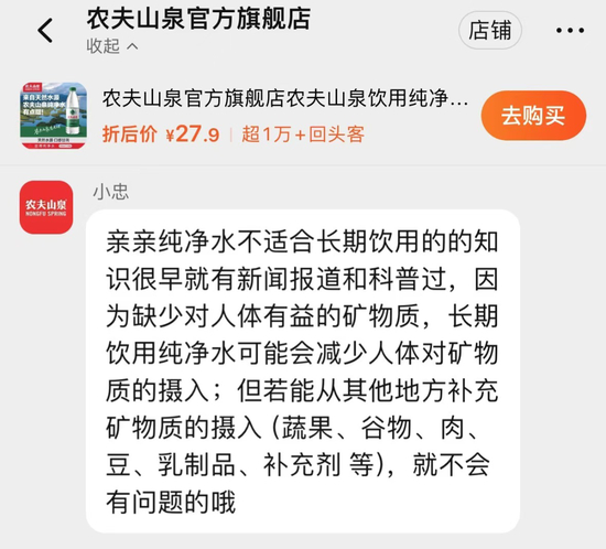 对此,农夫山泉官方旗舰店客服告诉证券时报记者:纯净水不适合长期饮用的知识很早就有新闻报道和科普过,因为缺少对人体有益的矿物质,长期饮用纯净水可能会减少人体对矿物质的摄入;但若能从其他地方补充矿物质的摄入(蔬果、谷物、肉、豆、乳制品、补充剂等),就不会有问题的。”