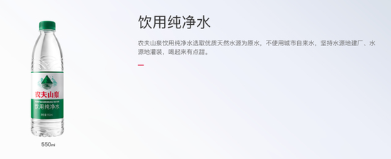 据了解,自2000年放弃纯净水业务后,二十多年来,农夫山泉包装水均来自天然水源,而同价格带的竞品以纯净水居多,形成差异化竞争。但在今年4月底,农夫山泉在时隔24年后重返纯净水赛道,直接杀入娃哈哈、怡宝等纯净水头部品牌的基本盘市场,并以低价策略在市场销售。在部分渠道,农夫山泉绿色包装的12瓶纯净水甚至只卖8.9元。